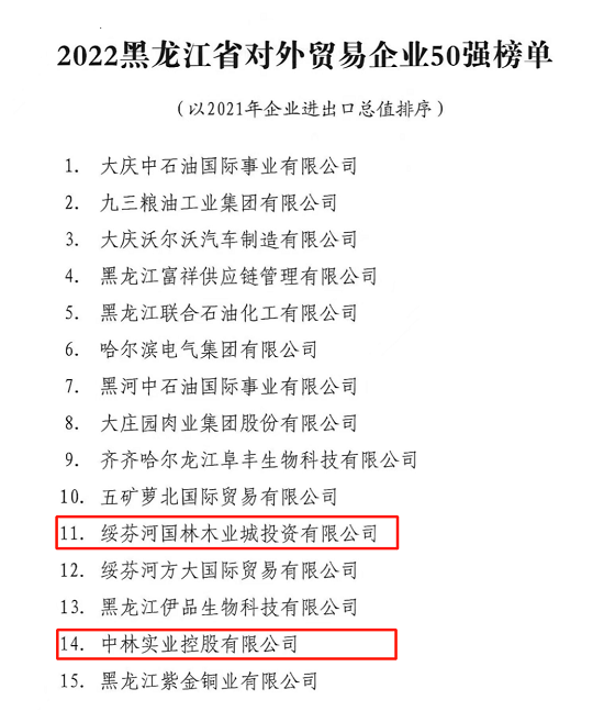 近日,《2022黑龙江省对外贸易企业50强榜单》在全省开放发展大会上发布。榜单依据2021年企业进出口总值排序,中林集团子公司中林实业控股及其下属绥芬河国林木业城投资有限公司分别位列榜单第14位和第11位。