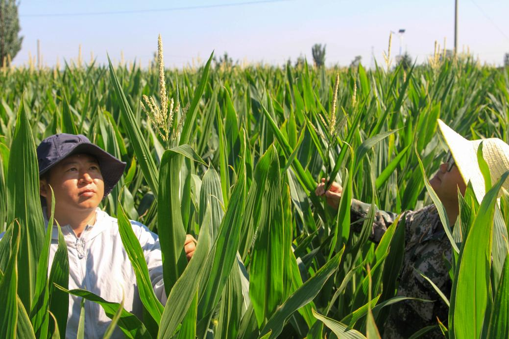 艳阳高照,金象种业制种基地中,技术员张登辉(左)财务资金部张海涛(右)正在完成夏季花检工作,用汗水为秋日丰收打下基础。