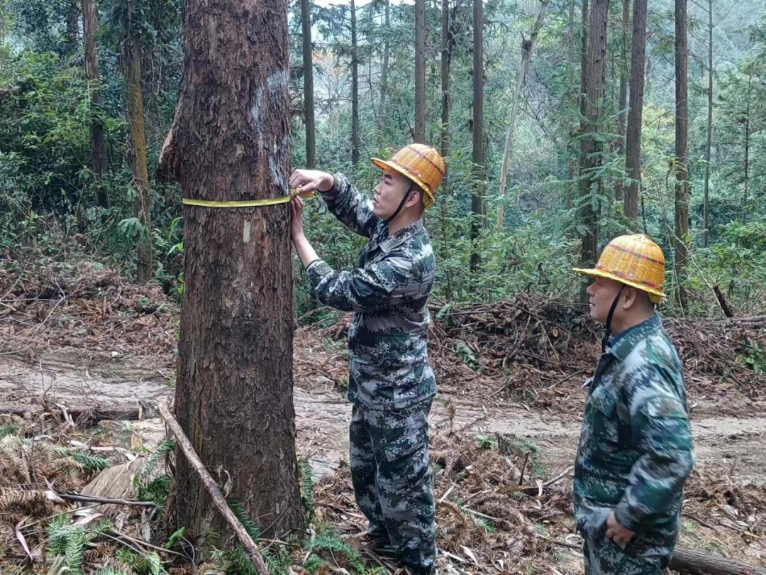 中林三明资源管理部吴远淼、大坑管理站杜明法在林地挥汗如雨,进行杉木胸径的测量。
