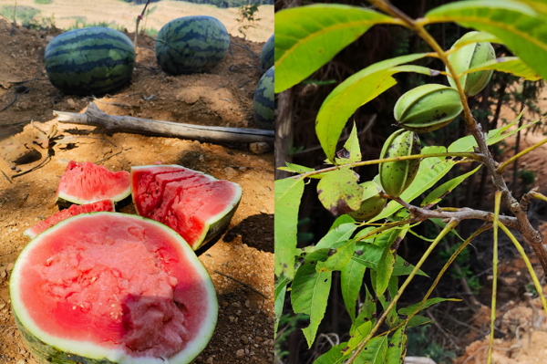 中林集团福建国储林项目首个碧根果种植基地正式开启后,碧根果苗长势旺盛、生机勃勃;果苗下的西瓜也硕果累累、瓜瓤鲜红、甘甜多汁,国储林+探索模式取得了喜人的成果。