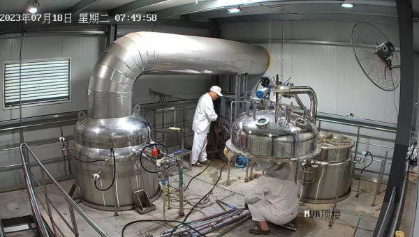 林场集团所属无锡太阳绿宝公司,MVR浓缩车间人员根据生产需要,不定期对从上至下整套设备、管道进行彻底清洗,确保过程(中间)产品符合卫生质量要求。(摄影:周跃辉)