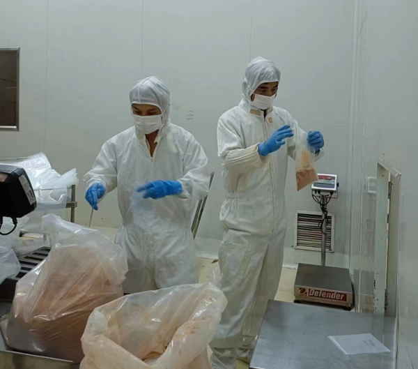 林场集团所属无锡太阳绿宝公司洁净车间人员正在进行产品混料操作,认真检查关键控制CCP点,确保产品合格、安全。(摄影:周跃辉)