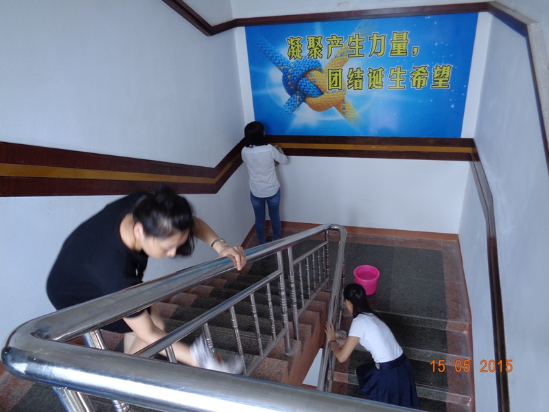 5月15日上午,局团委组织机关青年团员近20人开展义务劳动,清理机关办公大楼的楼梯、楼道及天花板等公共场所的环境卫生,以实际行动展现雷林青年人的活力和风采。 上午9时,青年团员们分成男生和女生两个小组进行清理打扫行动。其中女生组兵分两路从五楼开始对两边楼梯扶手自上而下进行清洁,她们有的提水,有的擦拭,有的清洗,非常认真细致,劳动过程中有说有笑,配合得亲密无间。男生组负责一楼、二楼的厕所、转角走道、天花板的蜘蛛网及卫生死角的清洁工作,他们拿着长扫、短扫、毛巾等工具,认真打扫,细致清理,发扬不怕苦、不怕累、不怕脏的精神,把机关办公楼公共场所的天花板打扫了一遍。最后,男女生在办公楼大堂及门口汇合,一起对荣誉奖牌、玻璃门及卫生死角等进行清扫擦拭。上午11时,经过两个多小时的辛苦劳动,青年团员们个个汗流浃背,略显疲态,但无半句怨言,整个劳动现场充满了欢声笑语。 本次义务劳动为机关青年团员提供了交流的平台,使他们感受到了劳动带来的快乐。