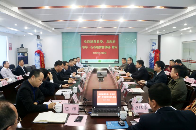 1月28日下午,雷林公司执行董事、总经理潘松海在公司四楼会议室会见了遂溪县委书记余庆创一行,双方就加强交流与合作进行了深入探讨。 潘松海对余庆创书记一行的来访表示欢迎,对遂溪县委、县政府一直以来给予雷林公司的支持和信任表示感谢,并介绍了雷林公司的四大主业板块:森林资源培育、林产品加工与贸易、花卉种植与林下经济、园区培育与休闲旅游开发,以及目前经营发展情况。他表示,遂溪发展潜力巨大,雷林公司将充分发挥在土地、林业产业、生态、科研等方面资源,积极融入遂溪的统筹规划并参与当地重大项目的建设实施,全力支持遂溪经济社会发展。