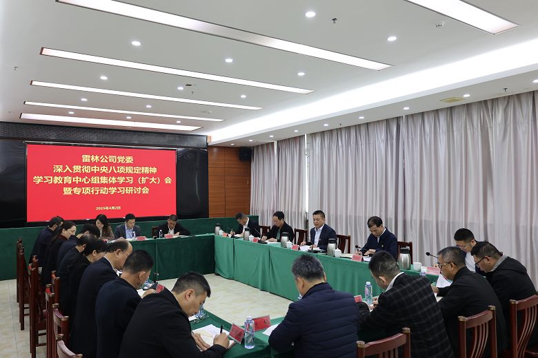 4月2日,雷林公司党委召开深入贯彻中央八项规定精神学习教育中心组集体学习(扩大)会暨专项行动学习研讨会,深入学习习近平总书记关于加强党的作风建设的重要论述和中央八项规定及其实施细则精神。公司党委副书记、董事、总经理陈强作强调讲话,公司领导班子、总部各部门负责人现场参会,所属各单位主要负责人在分会场以视频形式参加会议。
