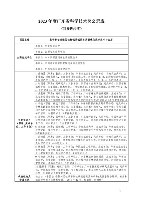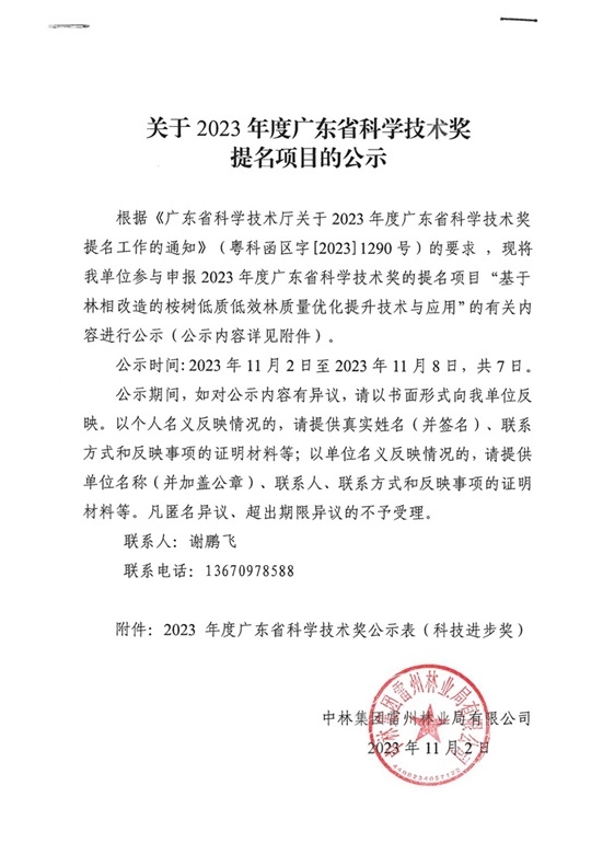 关于2023年度广东省科学技术奖 提名项目的公示