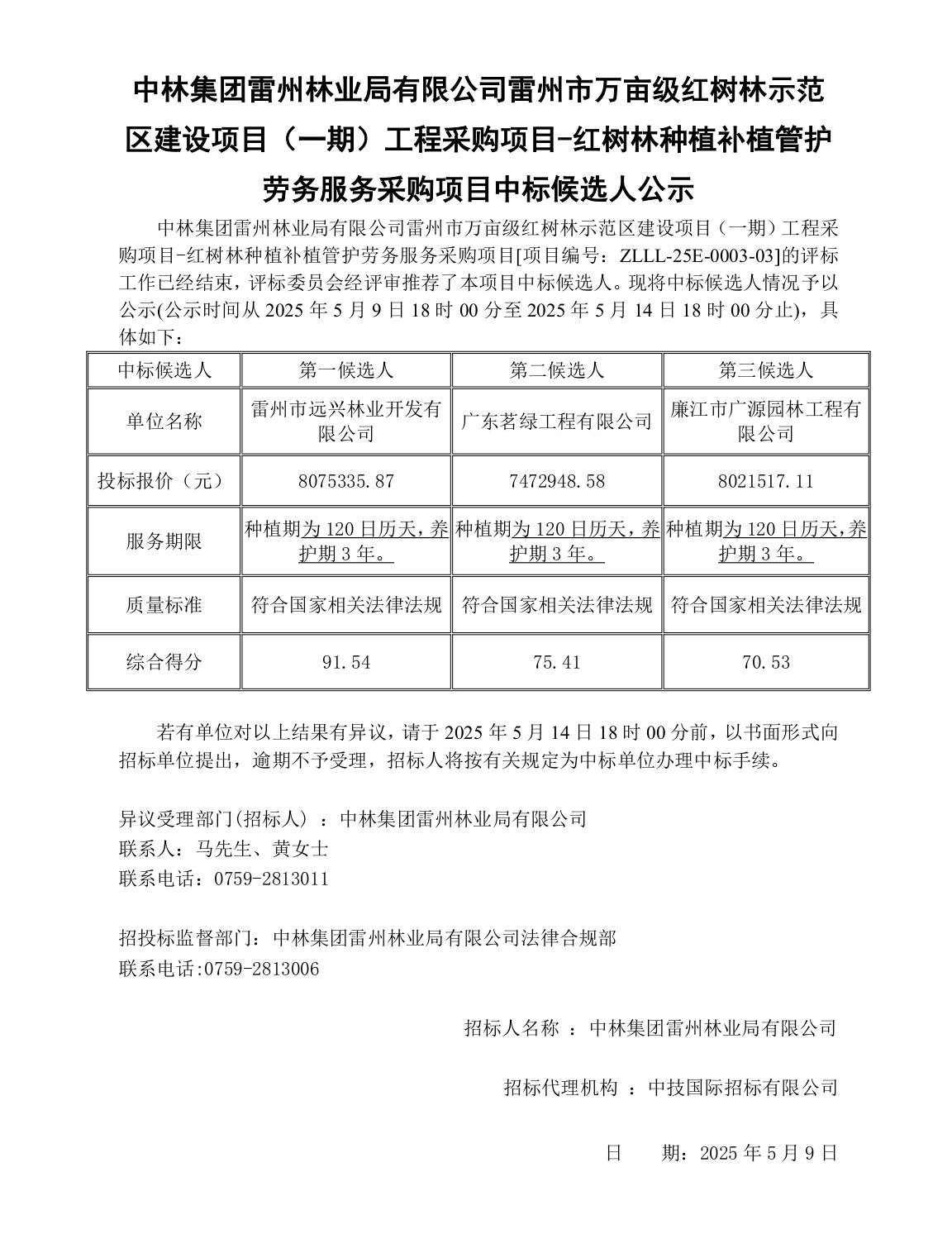 中林集团雷州林业局有限公司雷州市万亩级红树林示范区建设项目(一期)工程采购项目-红树林种植补植管护劳务服务采购项目中标候选人公示