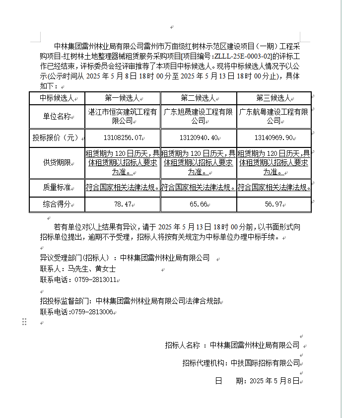 中林集团雷州林业局有限公司雷州市万亩级红树林示范区建设项目(一期)工程采购项目-红树林土地整理器械租赁服务采购项目中标候选人公示