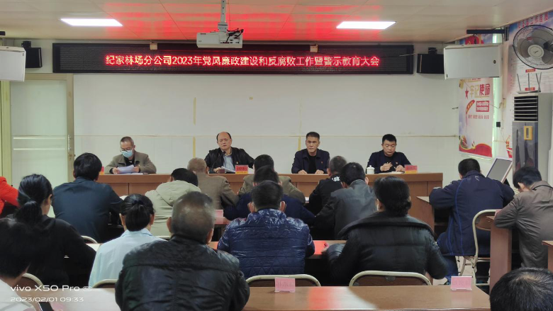 为深入贯彻落实党的二十大精神,切实加强分公司党风廉政建设。2月1日,纪家林场分公司召开2023年党风廉政建设和反腐败工作会议暨警示教育大会。分公司班子成员、机关副股以上人员、各林队队长、书记等共36人参加了会议。